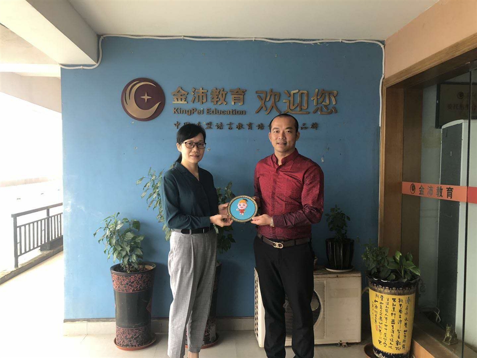 廣西金沛教育執(zhí)行董事粟宥朝右一向廣西國(guó)際文化交流中心羅副秘書(shū)長(zhǎng)(左一)贈(zèng)送吉祥物“金小沛”