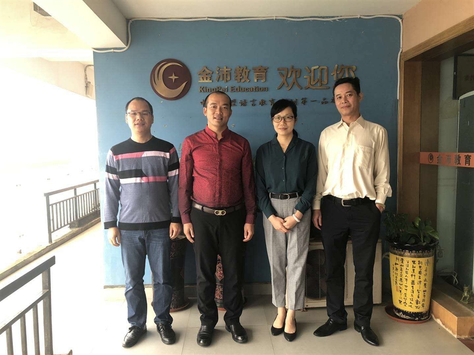 廣西金沛教育執(zhí)行董事粟宥朝左二)、國(guó)際部合伙人許顯鋒左一與廣西國(guó)際文化交流中心副秘書(shū)長(zhǎng)羅琨(右二)、經(jīng)濟(jì)科技部部長(zhǎng)吳偉(右一)一行合影留念