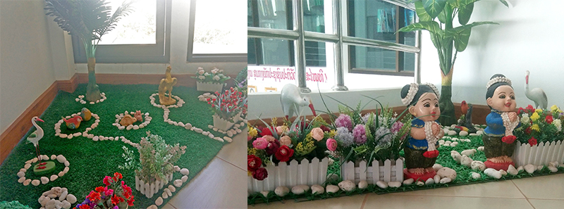 樓梯拐角處布置有陳設(shè)點(diǎn),用一些白色石頭拼湊圖案,輔以盆栽、鮮花、小人等裝飾,濃厚的學(xué)習(xí)氛圍中透出一絲活潑。