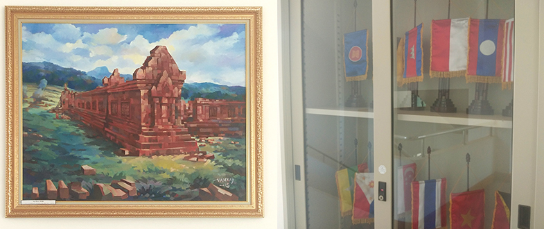 二樓樓梯拐角處掛著老撾古老寺廟油畫,旁邊的柜子里整齊擺放著幾排各國國旗;三樓樓梯拐角處掛的則是川壙省石缸平原油畫,旁邊的柜子里放置著一些老撾紀(jì)念品。