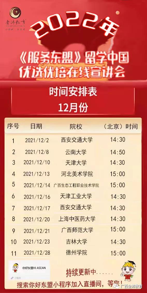 2021年12月2日起,由我司聯(lián)合多所高校開展的“2022年留學(xué)中國優(yōu)選優(yōu)培線上直播宣講會”將積極利用直播新形勢在“你好東盟”微信小程序上進(jìn)行開播。學(xué)校和師生、家長可通過小程序你好東盟、Facebook和Youtube直播等多種途徑收看本次宣講會。