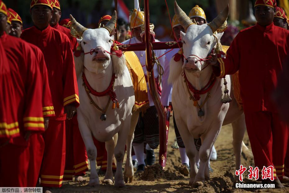 接著由婆羅門教士率領(lǐng)神牛、主犁官、女祭師進(jìn)行模擬耕種和播種。在神牛選吃稻谷、玉米、綠豆、芝麻、青草、水和酒儀式中,神牛選吃草意味著今年雨量充足,牲畜長(zhǎng)勢(shì)良好、榖物水果豐收。