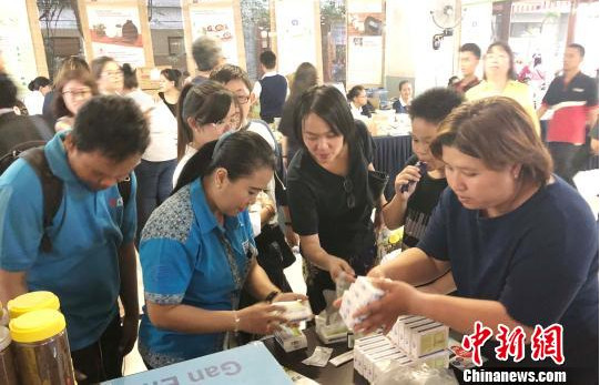 ▲圖為由中國知名中成藥企業(yè)主辦的一場活動(dòng)中,印尼民眾爭相購買太極藿香正汽口服液。鐘欣 攝