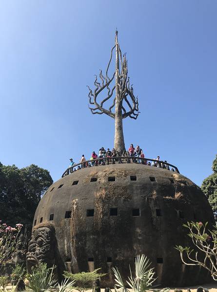 香昆寺里有一座球形的塔,與河對岸廊開(泰國)的萬橋公園遙相呼應,這便是著名的“天堂地獄塔”。每個來這里的人都要進去走一走,體驗從“從地獄到天堂”的過程。