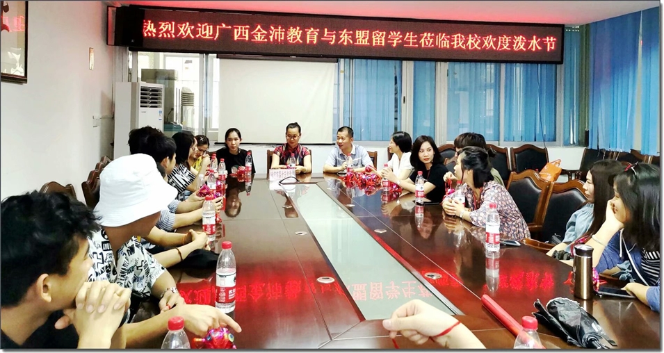 南寧市第十五中學盧副校長及譚主任親自到校門迎接并在會議室熱情接待了大家。在歡迎會上,盧副校長向東盟各國留學生介紹了學校概況并送上壯族特色的繡球表示歡迎。南寧市第十五中學是東盟文化相融合的特色高中,至此高考來臨之際,為增進師生互動,緩解高三學子的考試壓力,學校以東盟特色的潑水方式傳遞祝福、共同祈愿,同時也為中國學生與留學生提供了一個文化交流平臺。