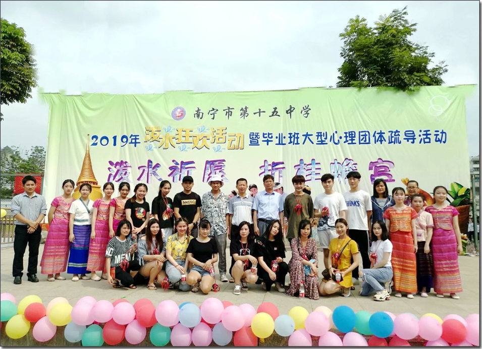 活動開始,高三學子進行“游龍翻身”的游戲,取“游龍翻身取金榜,十五中學我最棒”的含義。接下來身著東盟各國傳統(tǒng)服飾的學生為大家獻上了優(yōu)美的東盟國家舞蹈,展現(xiàn)了東盟各國的傳統(tǒng)舞蹈的魅力。隨后由學校校長帶隊,各年級老師共同參與,手持水瓢,將滿載祝福的水輕灑向所有高三學子,拉開了潑水狂歡的序幕。伴隨著歡快的音樂,潑水狂歡將本次活動帶向高潮,大家積極參與,手持水盆、小桶、水槍,你追我趕,相互潑灑,傳遞著著祝福與歡樂。以多種形式將各國文化風情融入學生的心理教育中。
