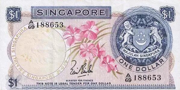 自 1965 年新加坡從馬來(lái)亞聯(lián)邦中退出并宣告獨(dú)立的兩年內(nèi),新加坡依舊使用著馬來(lái)亞與英屬婆羅洲元。直到 1967 年,原“馬來(lái)亞與英屬婆羅洲貨幣委員會(huì)”停止發(fā)行馬來(lái)亞與英屬婆羅洲元,新加坡才于當(dāng)年開始發(fā)行本國(guó)的鈔票“新加坡元”,簡(jiǎn)稱新元或新幣。