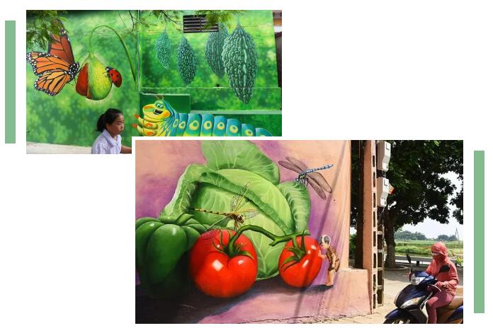 褚舍村以安全蔬菜種植業(yè)聞名,因此15幅大型壁畫重現(xiàn)了當?shù)剞r民的日常生活畫面,從各種農作物、蔬菜、果園,壁畫中一個純農業(yè)小村的畫面給參觀者帶來一種自然和美麗的視覺效果。