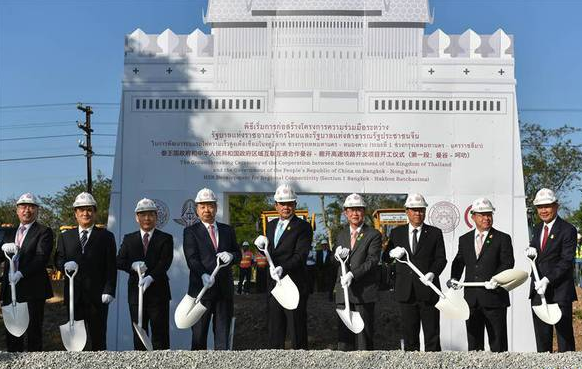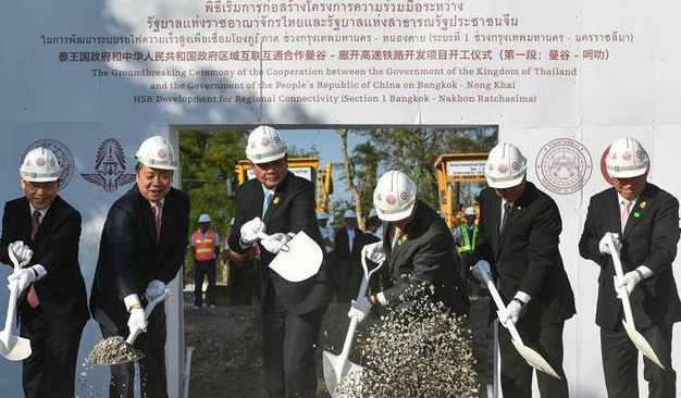 12月21日,泰國總理巴育(左三)與中泰鐵路合作聯(lián)委會中方主席、國家發(fā)改委副主任王曉濤(左二)等嘉賓們在泰國東北部呵叻府巴沖縣舉行的中泰鐵路合作項目一期工程開工儀式上共同鏟土。當(dāng)日,中泰鐵路合作項目一期工程開工儀式在呵叻府巴沖縣舉行。李克強總理向開工儀式發(fā)來賀信。泰國總理巴育親臨現(xiàn)場致辭。中泰鐵路合作聯(lián)委會中方主席、國家發(fā)改委副主任王曉濤、中國駐泰國大使呂健,泰國交通部長阿空、內(nèi)政部長阿努蓬,以及來自中泰政府部門、鐵路管理部門、相關(guān)企業(yè)、媒體等近400人出席開工儀式。新華社記者李芒茫攝