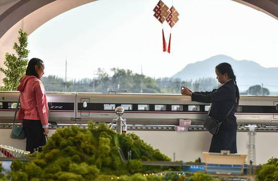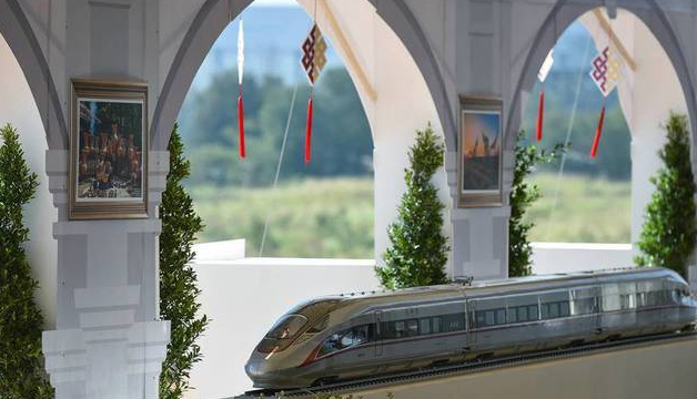這是在泰國東北部呵叻府巴沖縣舉行的中泰鐵路合作項目一期工程開工儀式上展出的中國復(fù)興號高鐵列車模型(12月21日攝)。