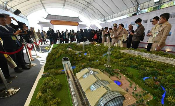 12月21日,在泰國東北部呵叻府巴沖縣,人們在中泰鐵路合作項目一期工程開工儀式上參觀項目沙盤模型。