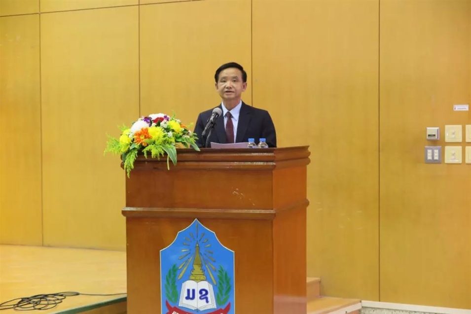 老撾國立大學(xué)副校長洪佩·占塔馮致歡迎辭。他代表老撾國立大學(xué)全體師生對許琳參事及代表團(tuán)一行到來表示熱烈歡迎!洪佩·占塔馮副校長回顧了老撾國立大學(xué)孔子學(xué)院從建立到快速發(fā)展的歷程。他說,許琳參事在任孔子學(xué)院總部總干事、中國國家漢辦主任期間,對老撾國立大學(xué)孔子學(xué)院的發(fā)展給予了熱情關(guān)懷,并大力推動(dòng)“中國政府援老撾國立大學(xué)孔子學(xué)院項(xiàng)目”的落實(shí),他代表國立大學(xué)對許琳參事表示衷心感謝!他同時(shí)還表示,許琳參事本次講座的主題非常有意義,對教育全球化的發(fā)展提出了機(jī)遇和挑戰(zhàn),也有利于促進(jìn)老撾國立大學(xué)鏈接區(qū)域與國際的未來發(fā)展。