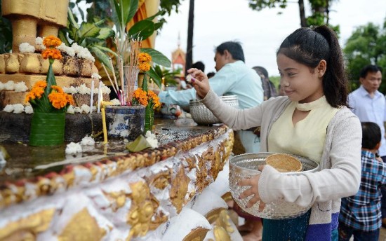 老撾人在寺院拜佛、浴佛、潑水、栓線、布施、堆沙、放生等,同時(shí)在家里、大街上相互潑水、祝福,讓純潔的水洗刷掉過(guò)去的疾病、災(zāi)禍和祈求來(lái)年雨水充沛,五谷豐登,迎接美好的新的一年。