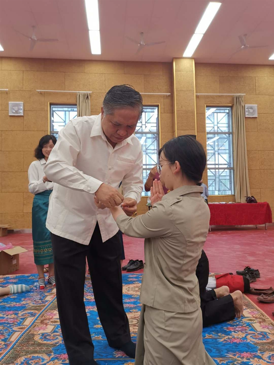 (老撾國立大學(xué)校長宋西.諾潘塞在給老師栓線祝福