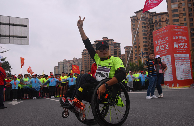 在眾多的選手中,坐在輪椅上的張先生顯得尤為搶眼。張先生來(lái)自廣州,他告訴記者,這是他參加的第54場(chǎng)馬拉松比賽,也是第一次參加全海景跑道的馬拉松, “我參加比賽不是為了出成績(jī)或出風(fēng)頭,而是重在參與,是想體現(xiàn)一種精神?!睆埾壬f(shuō),他不一定能全部“跑”完全程,但他一定會(huì)堅(jiān)持到最后。