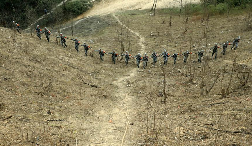 掃雷官兵手拉手走過完成清理的中越邊境廣西段某雷場(12月22日攝)。為了讓百姓放心,向地方政府交付雷場時,掃雷官兵將手拉手在作業(yè)完的雷場上來回走幾遍。 11月27日,中越邊境廣西段新一輪掃雷行動全面啟動。此次行動的主要任務是徹底掃除和封圍廣西邊境附近53處共計約205萬平方米的雷場。12月22日,記者隨南部戰(zhàn)區(qū)陸軍廣西西線掃雷隊,前往中越邊境某雷場,用照片紀錄排雷官兵清理雷區(qū)的驚險過程。