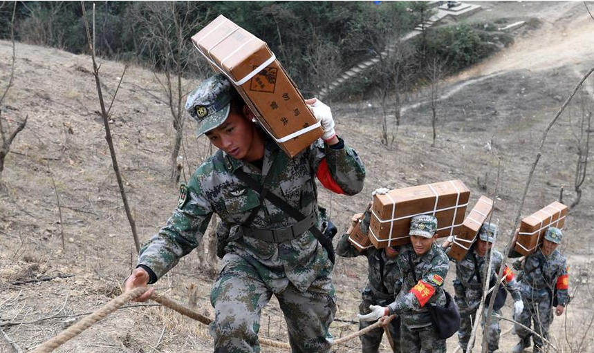 掃雷官兵在中越邊境廣西段某雷場搬運炸藥,準備爆破作業(yè)(12月22日攝)。掃雷官兵在作業(yè)前要對雷區(qū)進行爆破作業(yè),清除雷場植被,方便后期搜排。
