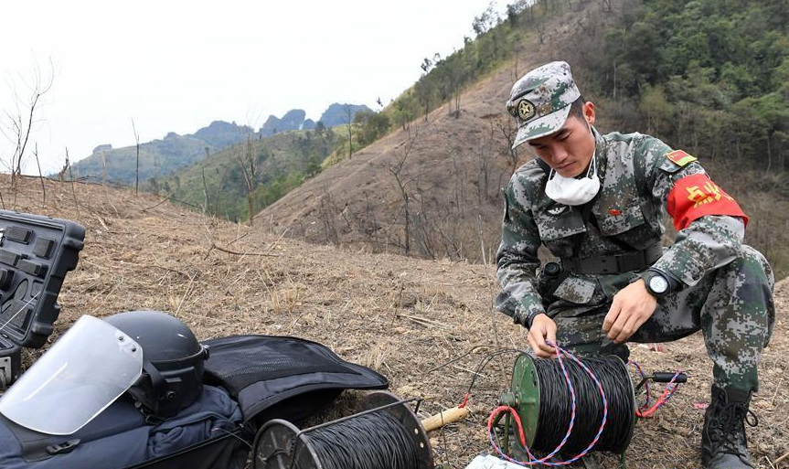 一名掃雷戰(zhàn)士在中越邊境廣西段某雷場檢查爆破線路
