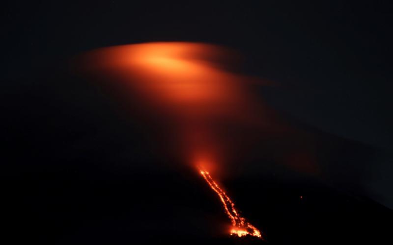馬榮火山口目前已經(jīng)能看到明顯火光,意味著劇烈的巖漿活動,同時發(fā)現(xiàn)有熔巖流向南側(cè)山坡(法新社)